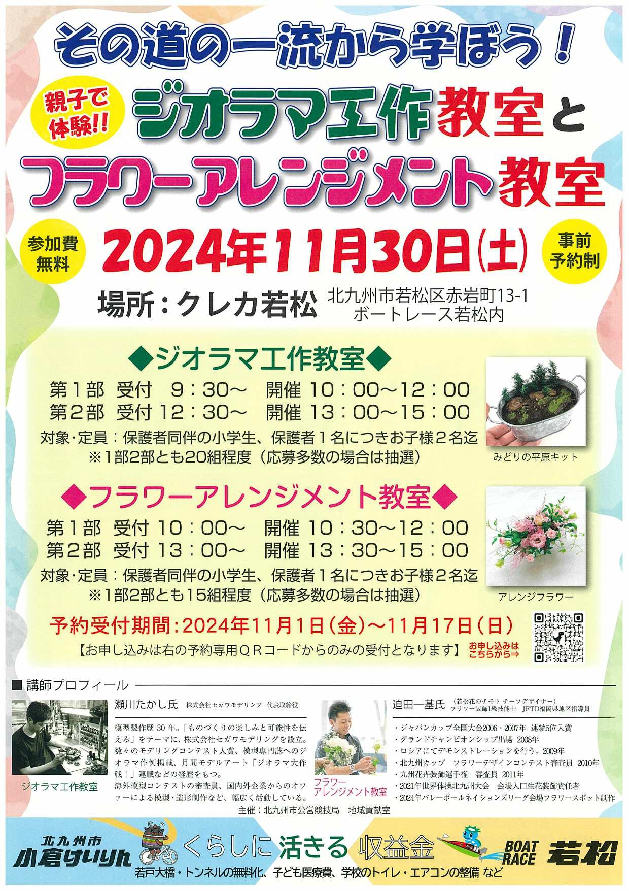 11月30日にクレカ若松(※ボートレース若松内)で『親子で体験!ジオラマ工作教室&フラワーアレンジメント教室』を開催します。それぞれプロの講師から作り方を教えてもらえるので、とても貴重な体験になりますよ。ご家庭に飾ることを考えて作るのも楽しそうですね。いずれも参加費は無料。対象は保護者同伴の小学生で、保護者1人につき子ども2人まで参加可能です。ジオラマ工作教室は各回20組程度、フラワーアレンジメント教室は各回15組程度(※応募者多数の場合は抽選)で実施します。申し込みは専用フォームから。