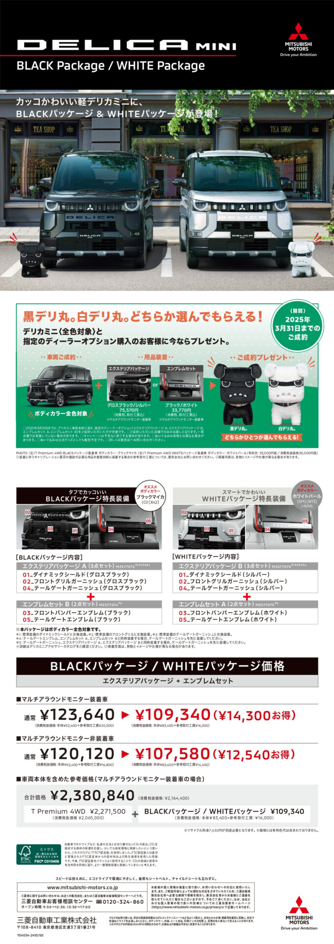 今、デリカミニと指定のディーラーオプションをご購入いただくと デリカミニ公式キャラクターの『デリ丸。』ぬいぐるみをプレゼントいたします。『黒デリ丸。』または『白デリ丸。』どちらかお好きな『デリ丸。』をお選びください。デリカミニは九州三菱自動車販売(株)北九州支店各店舗にてご試乗いただけます。 ぜひこの機会にご来店くださいませ。