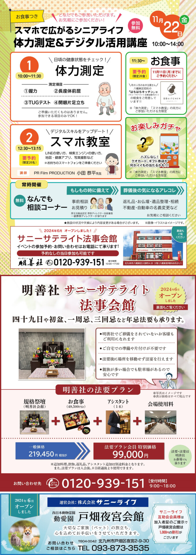 6月にオープンした新施設「サニーサテライト法事会館」でイベントを開催します!スポーツや学習の秋!今回は「体力測定」と「スマホ教室」を行います。また、当日は3階の法事会館をご見学いただけるほか、1階の仏壇メモリアルコーナーにて仏壇・仏具の展示販売もございます。そのほか事前相談やお見積り、法要のご相談、ご家庭の不用品整理や葬儀後の各種手続きのご相談なども当日無料で承ります。ぜひお誘いあわせの上、ご参加ください!
