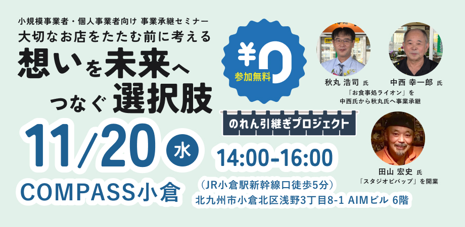 事業承継マッチングプラットフォーム「relay」を運営する株式会社ライトライトは11月20日、AIMビル6階のCOMPASS小倉(北九州市小倉北区浅野3-8-1)で小規模事業者・個人事業者向けの事業承継セミナー「想いを未来へつなぐ選択肢」を開催します。