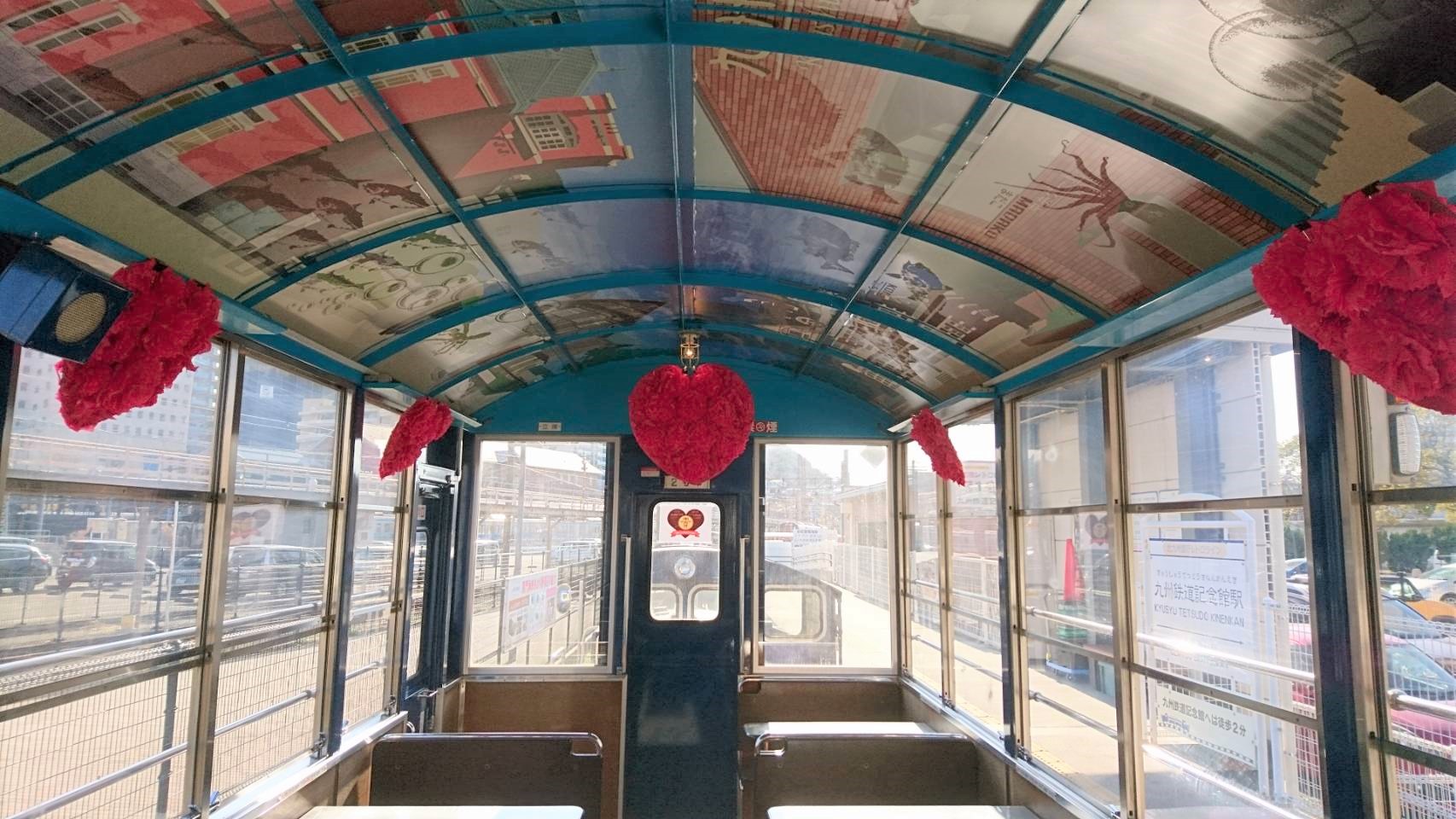 2月13日(土)・14日(日)の2日間限定で走るバレンタイン特別列車の車内には、潮風号を運営する平成筑豊鉄道の職員の皆さんがバレンタインをイメージし、一つ一つ手づくりした真っ赤な“ハート”がいくつも飾り付けられています。