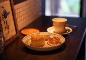 「アクセサリーがメインで、喫茶も楽しんでいただける場所に」とのことでしたが、喫茶のメニューもNonさんのこだわりがしっかりと表現されていて、メインのお菓子「スコーン」は本場イギリス式で作られているそうです。飲み物はスコーンに合うように「和紅茶」が提供されます。