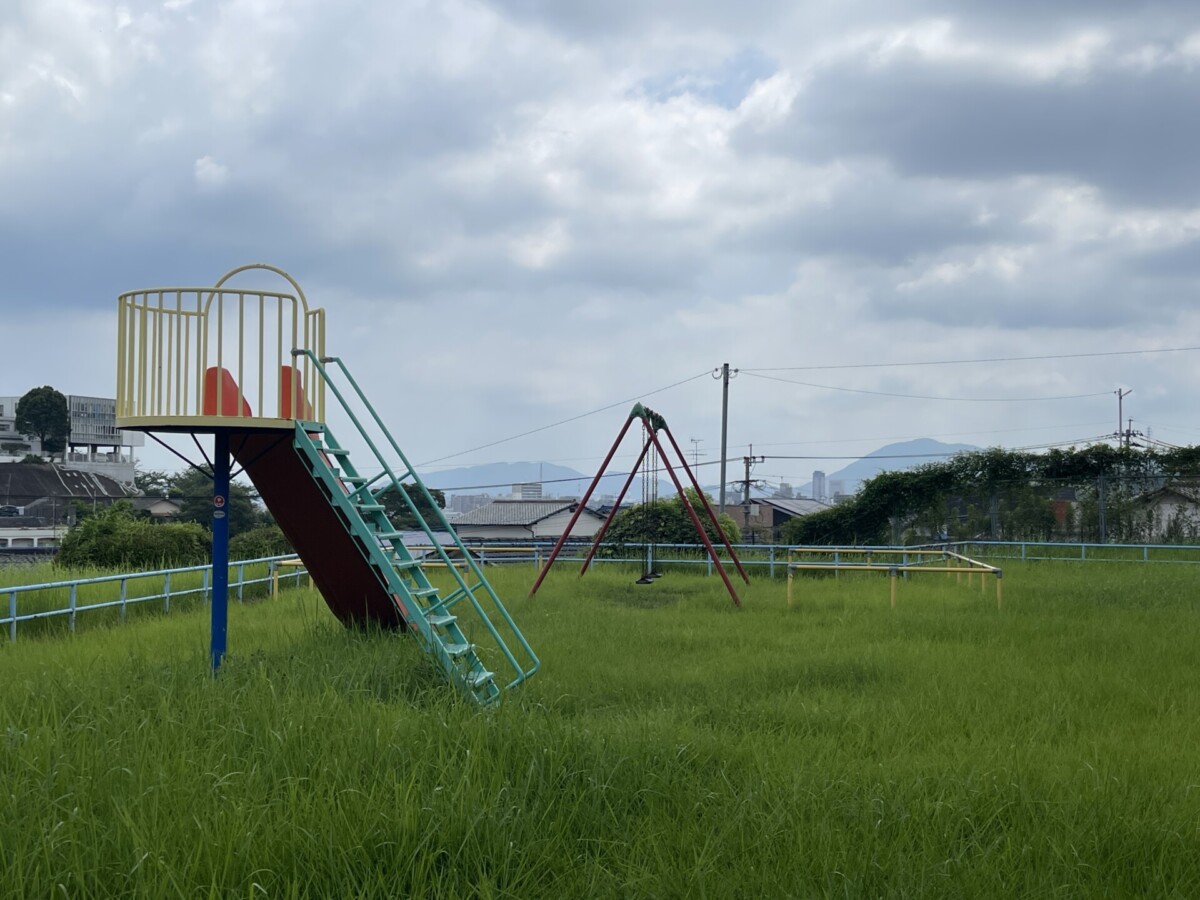 少し進むと、ブランコや滑り台などの遊具の設置された広場が見えます。草が生い茂っているので、奥まで進むのは断念しました。
