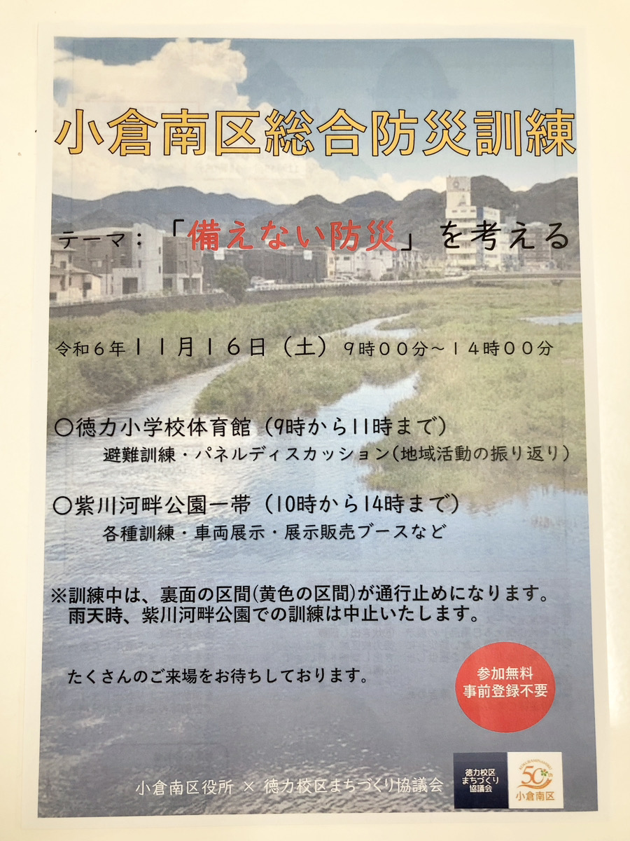 「小倉南区総合防災訓練」が11月16日、北九州市立徳力小学校と紫川河畔公園一帯で開催されます。