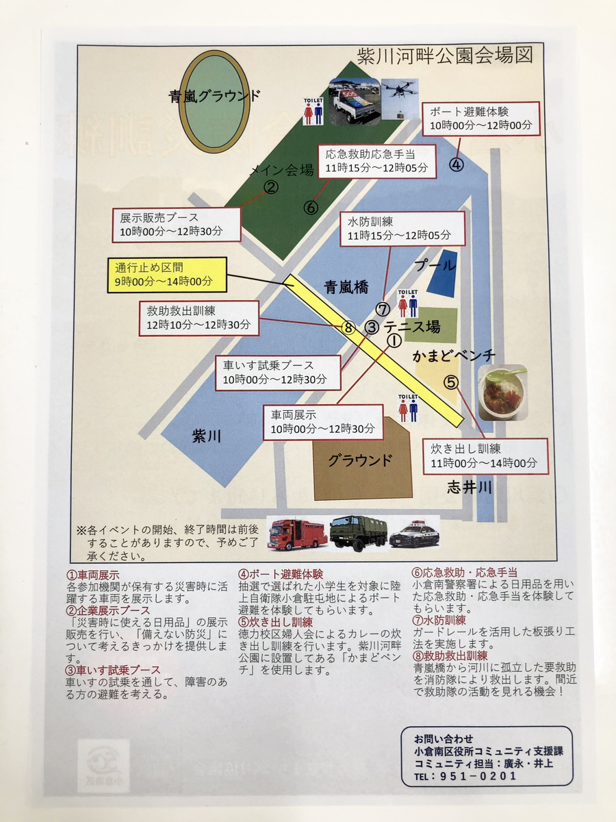 紫川河畔公園では自衛隊によるボート避難体験や炊き出し訓練のほか、災害時に活躍する車両の展示、災害時に使える日用品の展示販売ブース、車いす試乗ブースといった「備えない防災」をテーマとした各種訓練などを実施予定です。