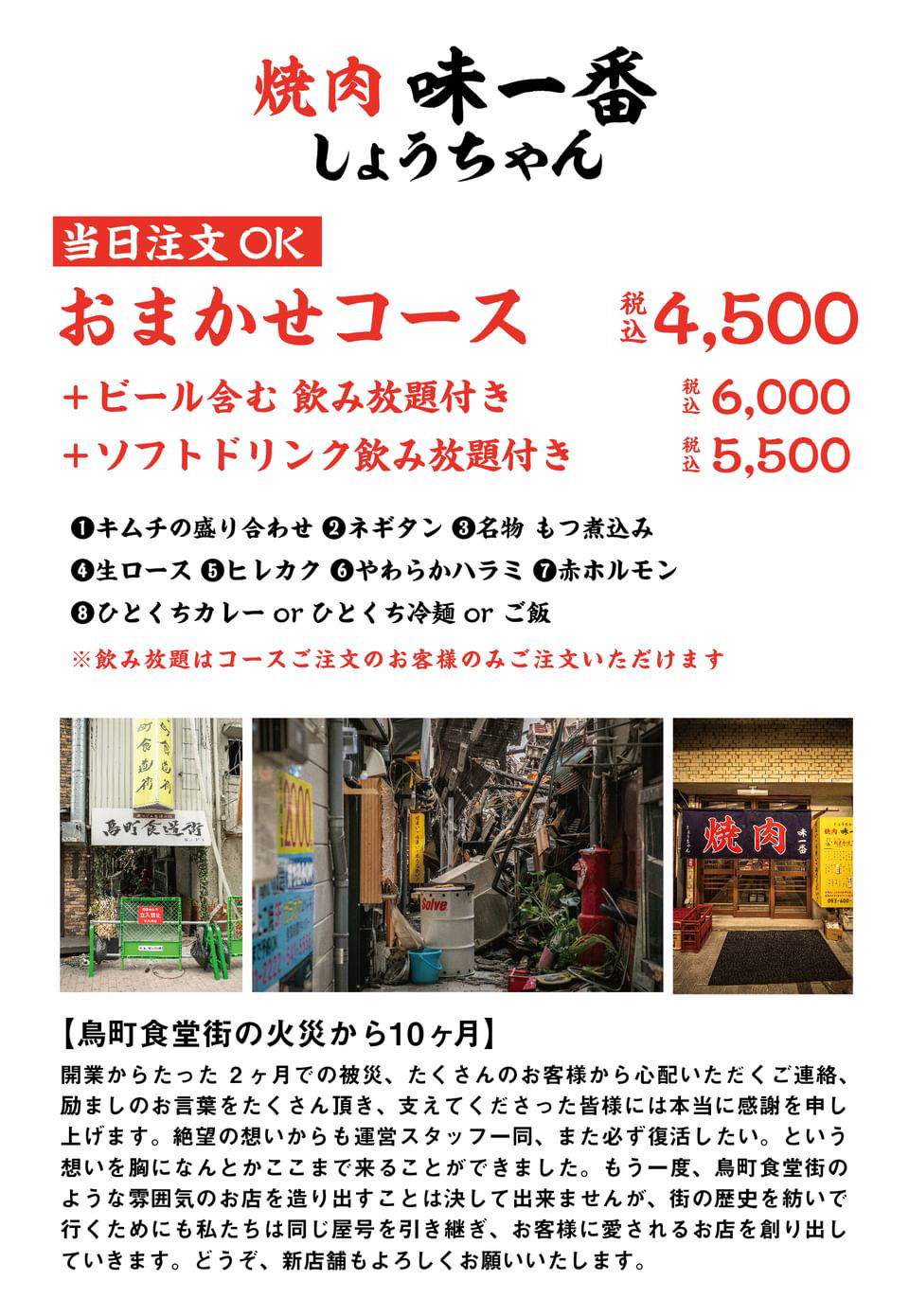 今年1月3日に発生した鳥町食堂街の火災により臨時休業していた「焼肉 味一番 しょうちゃん」が11月11日、移転オープンしました。