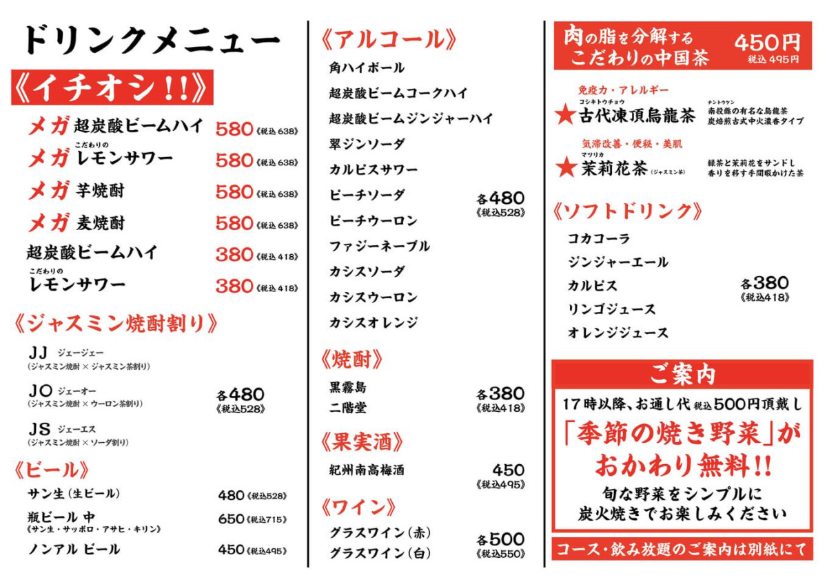 午後3時〜午後5時限定で、ハッピーホルモンセットもあります。生ビールやメガサイズを含むドリンク3杯と、もつ煮込み・ミックスホルモン・焼き野菜がついています。