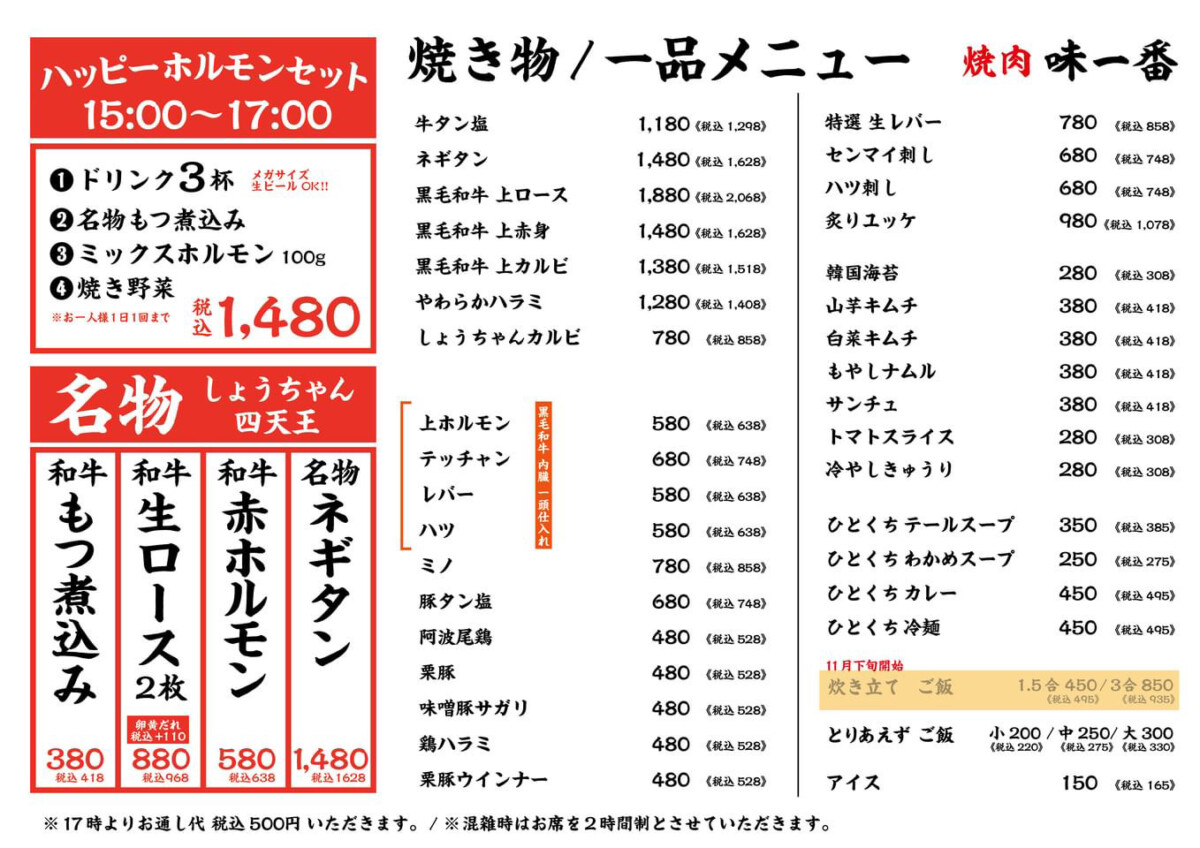 メニューは、「しょうちゃんカルビ」や「やわらかハラミ」など定番をはじめ、黒毛和牛や阿波尾鶏、栗豚など素材にこだわったメニューもあります。