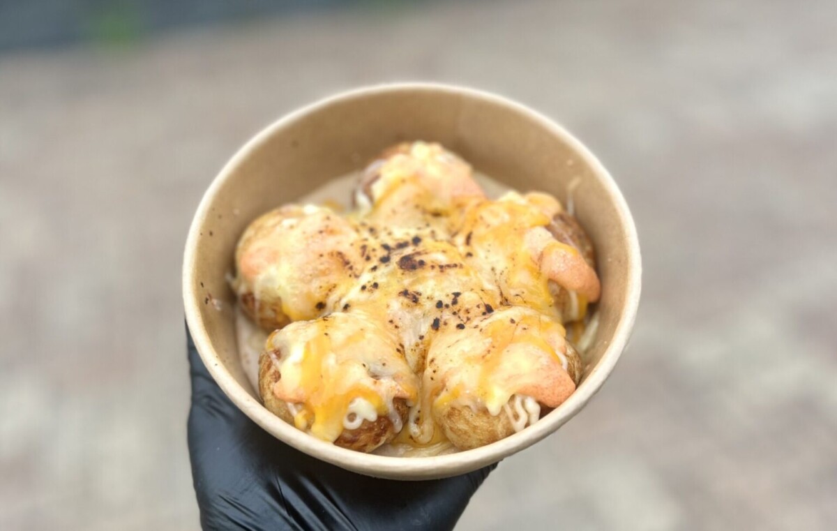 月乃たこやきの「こんがり炙りチーズたこやき」は、2種類のチーズと粉チーズをのせて炙ったたこやき。8種のメニュー全てに炙ったチーズをトッピングすることができるのだとか。