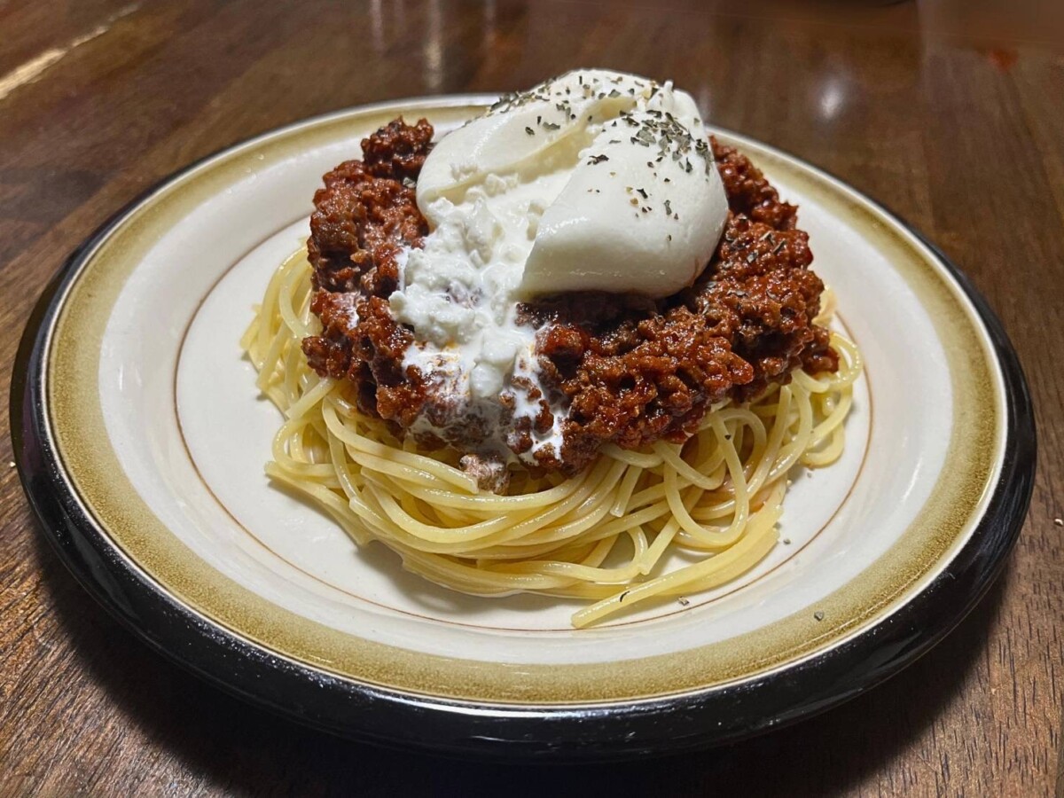 次に、アイリーエレファンテの「王様ボロネーゼ」。生クリームと細かくしたモッツァレラで造った餡を、さらにモッツァレラで包んだミルキーな「ブッラータ」がのっています。