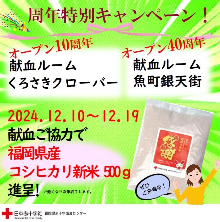 同ルームでも、ふたたび献血の大切さを知ってもらう機会として<献血ルーム 魚町銀天街>40周年キャンペーンとして、12月10日から12月19日まで献血の協力をされた方に「福岡県産コシヒカリ新米500g」が進呈されます。