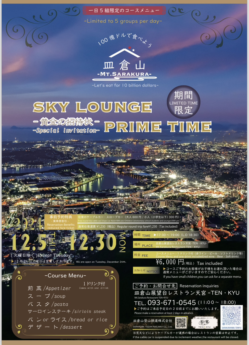 皿倉山展望台レストラン「天宮」(北九州市八幡東区大字尾倉1481-1)は12月5日から12月30日までの期間限定で、1日5組限定のスペシャルコース「SKY LOUNGE PRIME TIME-黄金の招待状-」を提供します。