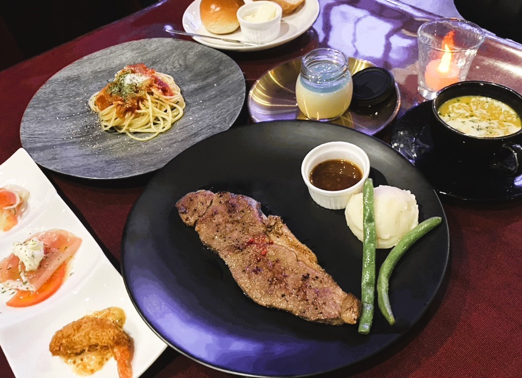 ■料理/前菜・スープ・パスタ・サーロインステーキ・パンorライス・デザート・1ドリンク付き