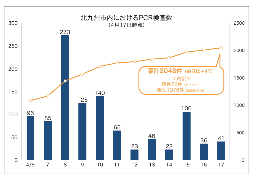 北九州市は、PCR検査を行った人数と、検査結果を連日発表しています。これによると、4月17日の市内の検査数は41件。累計は2048件となりました。陽性率は3.5%です。