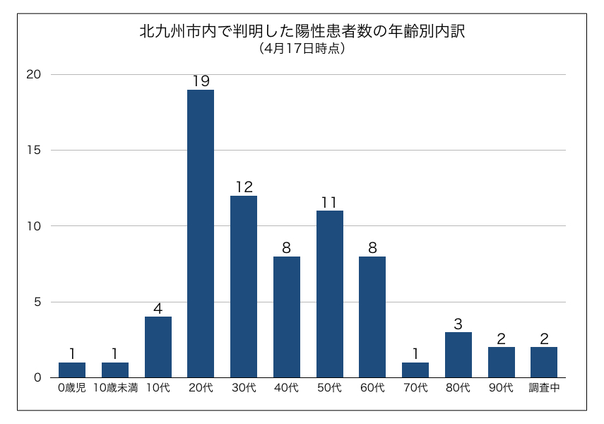 記事公開時、記事の本文およびグラフのデータに誤りがありました。お詫びして訂正いたします。「30歳代」を「13人」としていましたが、正しくは「12人」。「調査中」を「1人」としていましたが、正しくは「2人」。「小倉北区」を「19人」としていましたが、正しくは「18人」。「門司区」を「12人」としていましたが、正しくは「13人」です。なお、記事内で使用しているデータは、北九州市が発表している情報を基にまとめています。福岡県等、他自治体が公表している北九州市民は含まれません。一方、周辺自治体在住者で北九州市内で検査、判明した人の情報が含まれます。