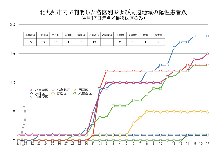 ※当記事は、2020年3月1日~4月17日までに北九州市が発表した市内の感染者数をまとめています。