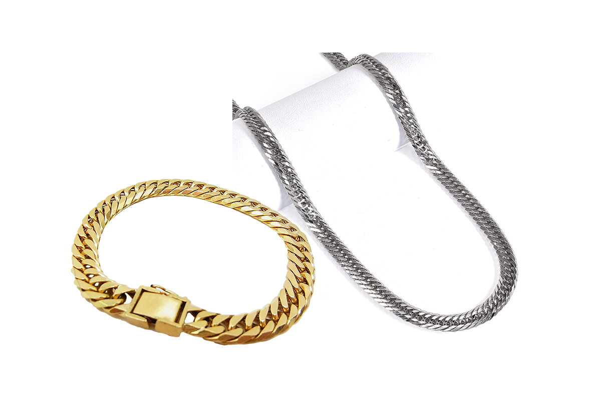 「喜平」は、主に金とプラチナの素材が使われ、チェーンを平らに加工したデザインのアクセサリー。ネックレスやブレスレットに使用され、重量が重くシンプルで高級感のあるデザインが特徴です。