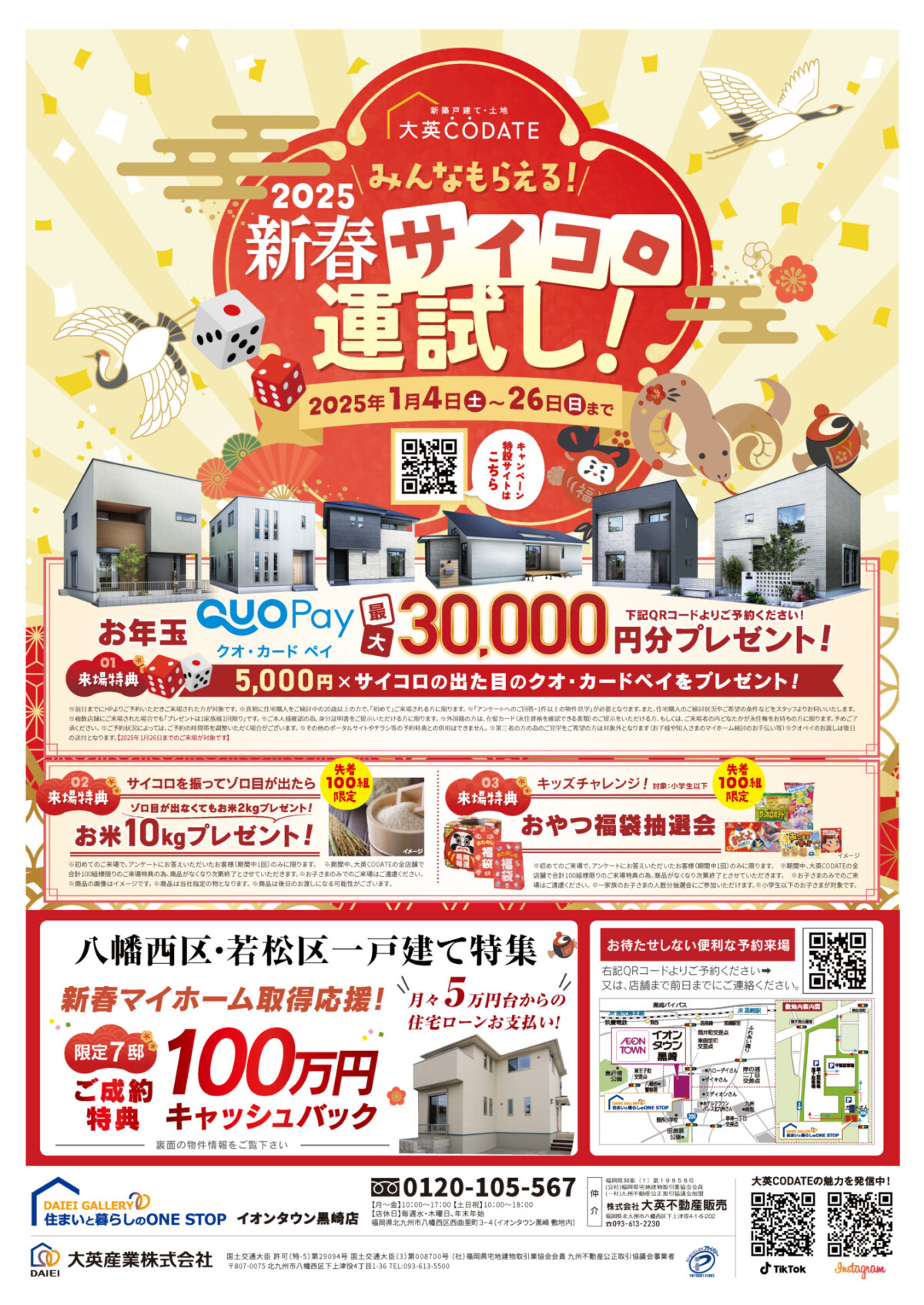 大英産業の「住まいと暮らしのONE STOPイオンタウン黒崎店」では、2025年1月4日(土)~26日(日)の期間中に「新春サイコロ運試しキャンペーン」を開催。
