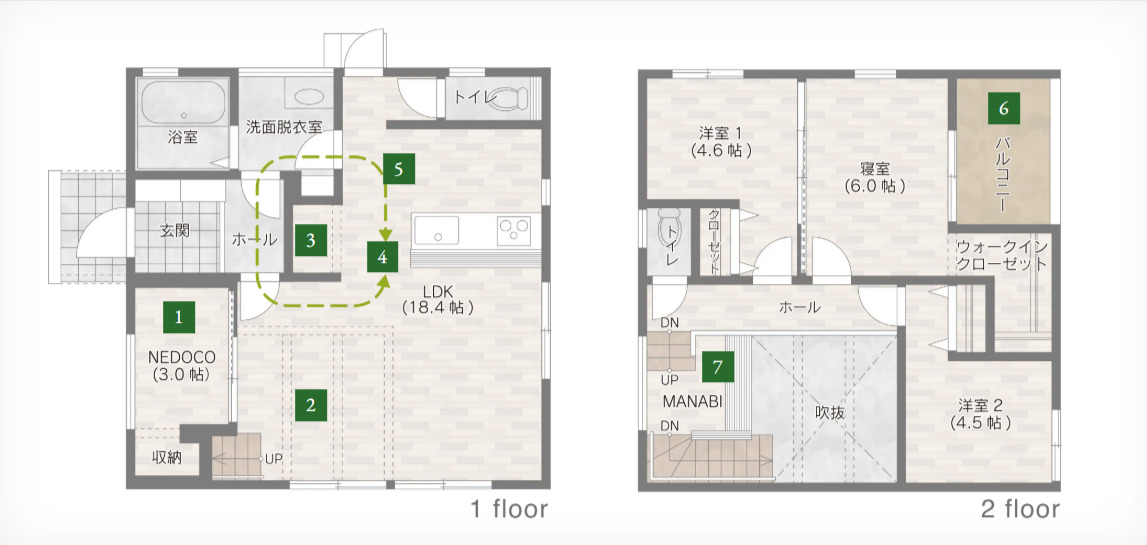 “玄関ホール→脱衣所→キッチン→リビング“をくるっと一周できるラクラク導線も設計されています。