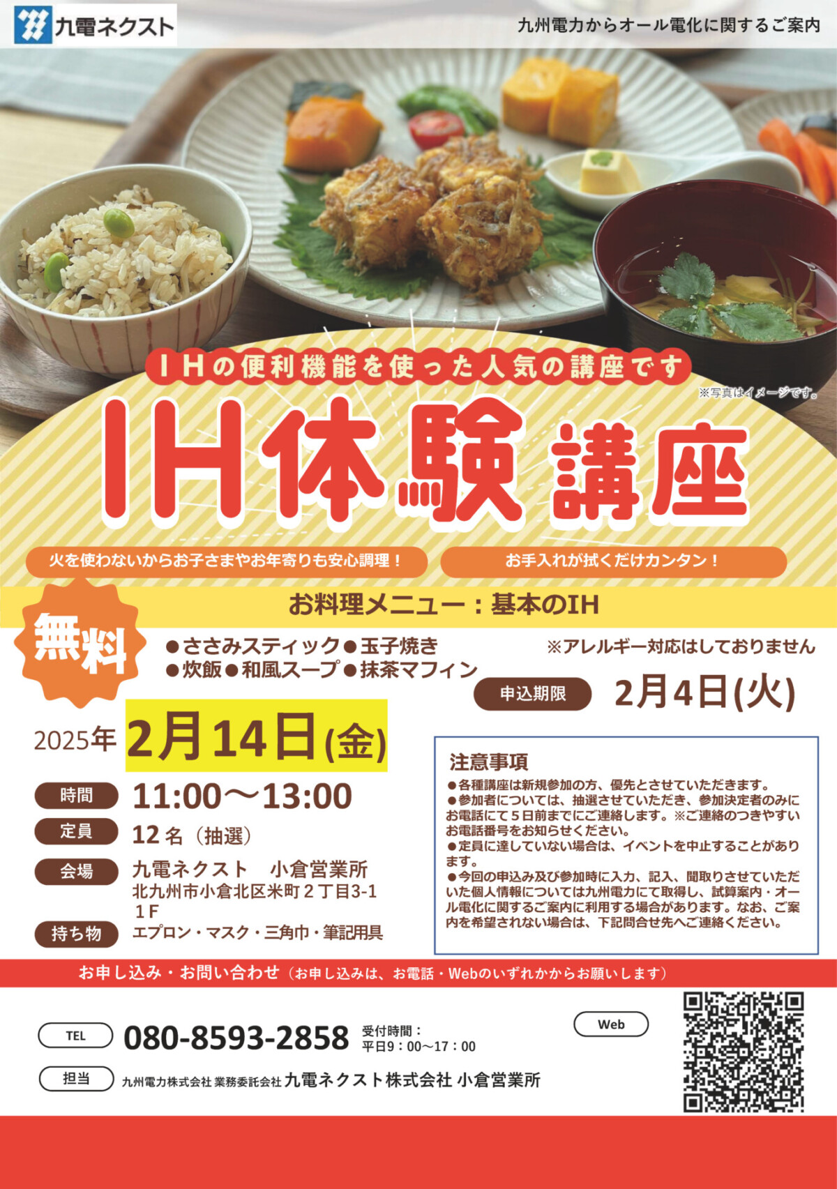 きゅうでんe-住まいる北九州では、定期的にIH体験講座を開催しおり、現在2月14日(金)の「IHクッキング講座」の参加者を募集しています。参加費は無料です。