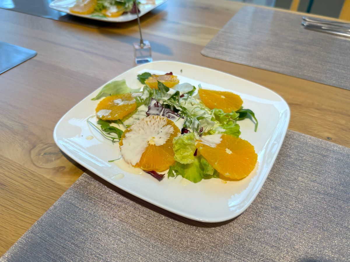 新鮮な野菜とオレンジを一緒に盛り付けます。その上に、先ほどの特製ドレッシングをかけて仕上げます。