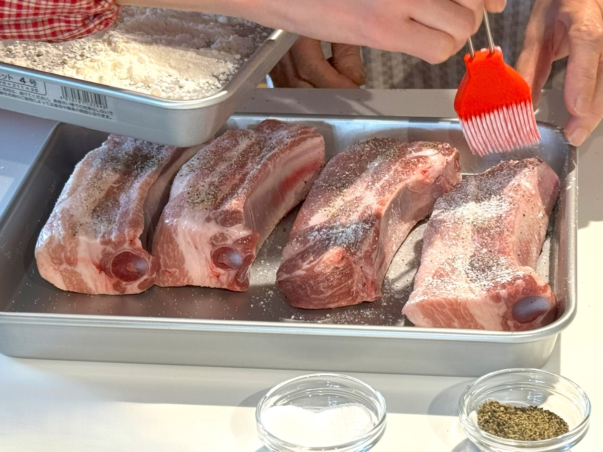最初に、室温に戻したスペアリブに塩・コショウで下味をつけ、小麦粉をまぶします。この小麦粉が焼き色を美しく仕上げ、煮込んだ際にソースにとろみをつけてくれます。