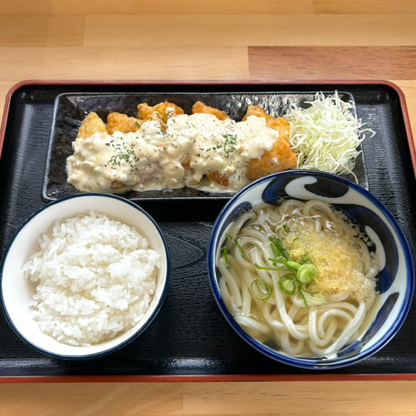 チキン南蛮とうどん、ご飯がセットになった「チキン南蛮セット」もあります。チキン南蛮がのせてあるうどんはあまり見たことがないので、とても気になりますね。