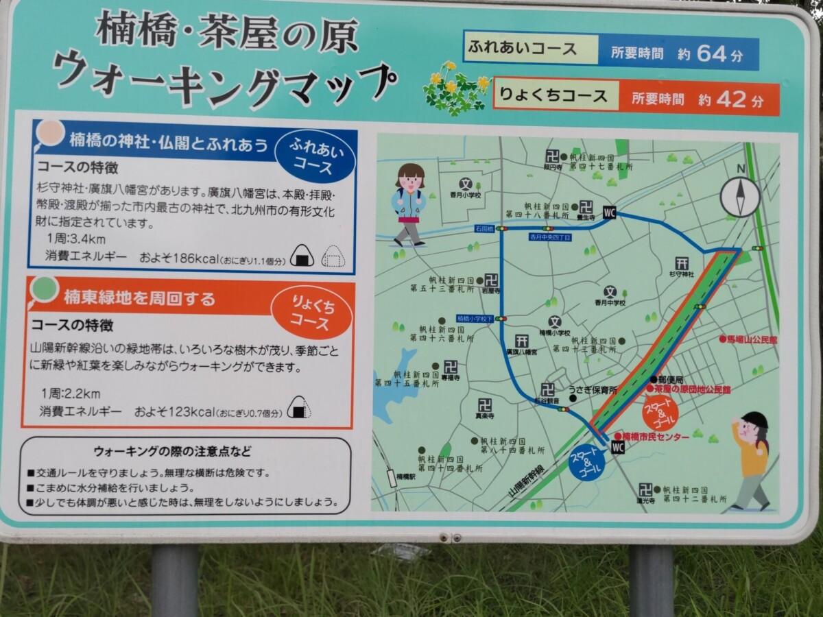 緑地の中に「ウォーキングマップ」が設置してあるのを見つけました。マップには1周3.4㎞の楠橋の神社・仏閣にふれあう「ふれあいコース」と、1周2.2kmの楠東緑地を周回する「りょくちコース」の2つのコースが紹介されています。