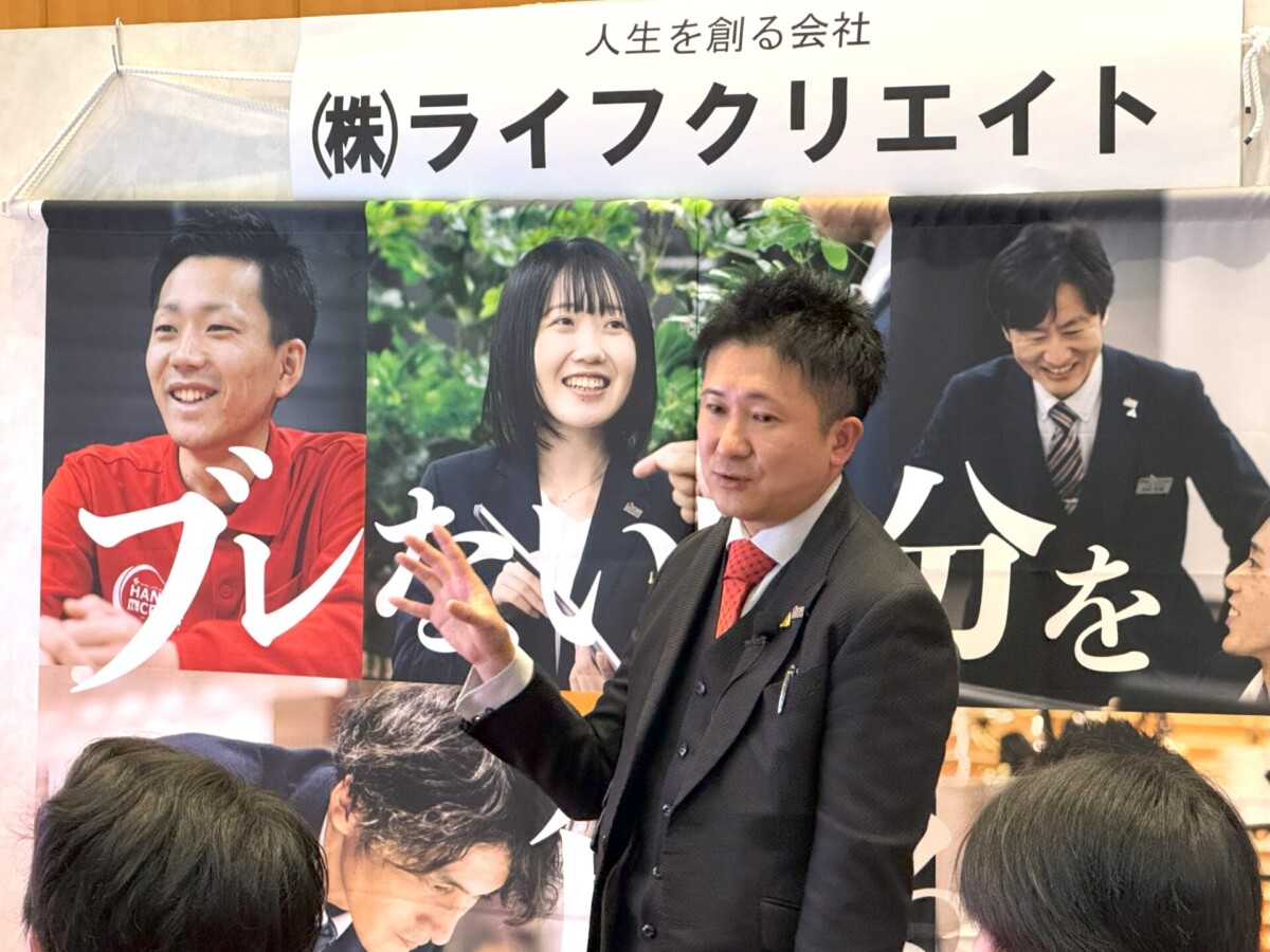「ただ働くだけでなく、人生を豊かにする」というライフクリエイトの考え方を、熱意をもって伝える若手社員の姿は、会社の未来を支える力そのものです。