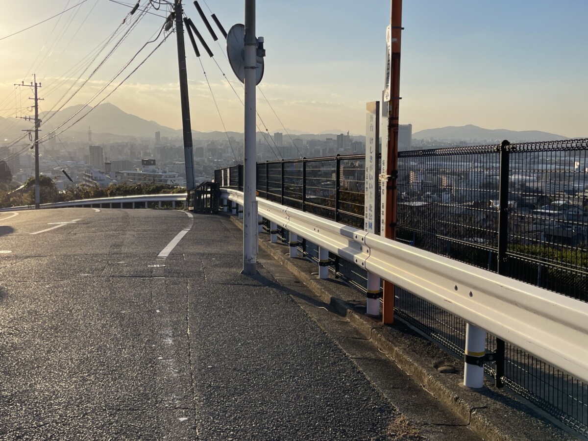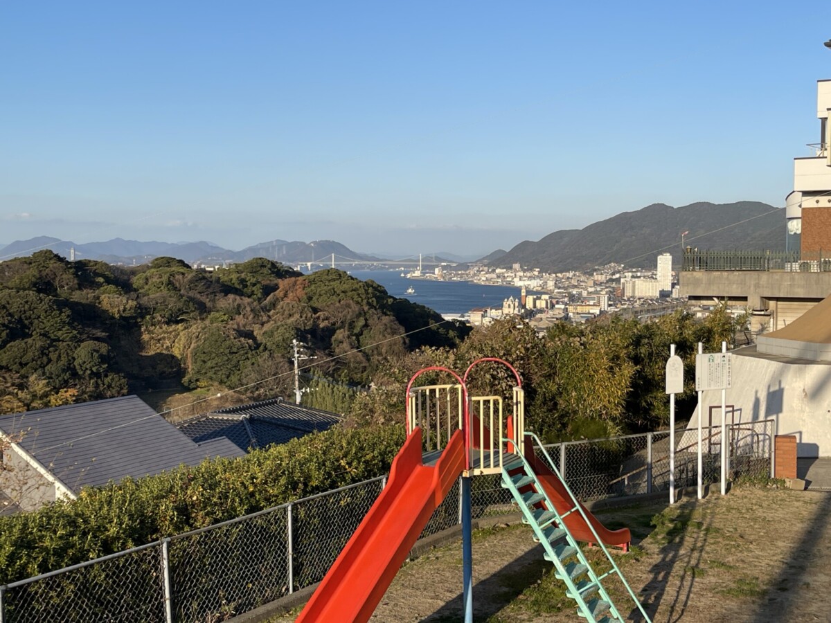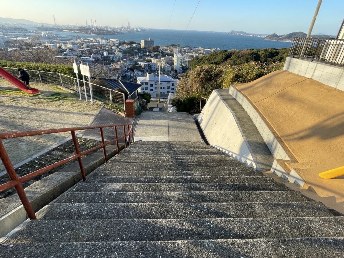 坂を歩いて登ると、途中で海が見えてきます。公園のフェンスが見えたかと思うと、その向こう側に小倉の街全体を眺められるほどの景色が広がっていました。
