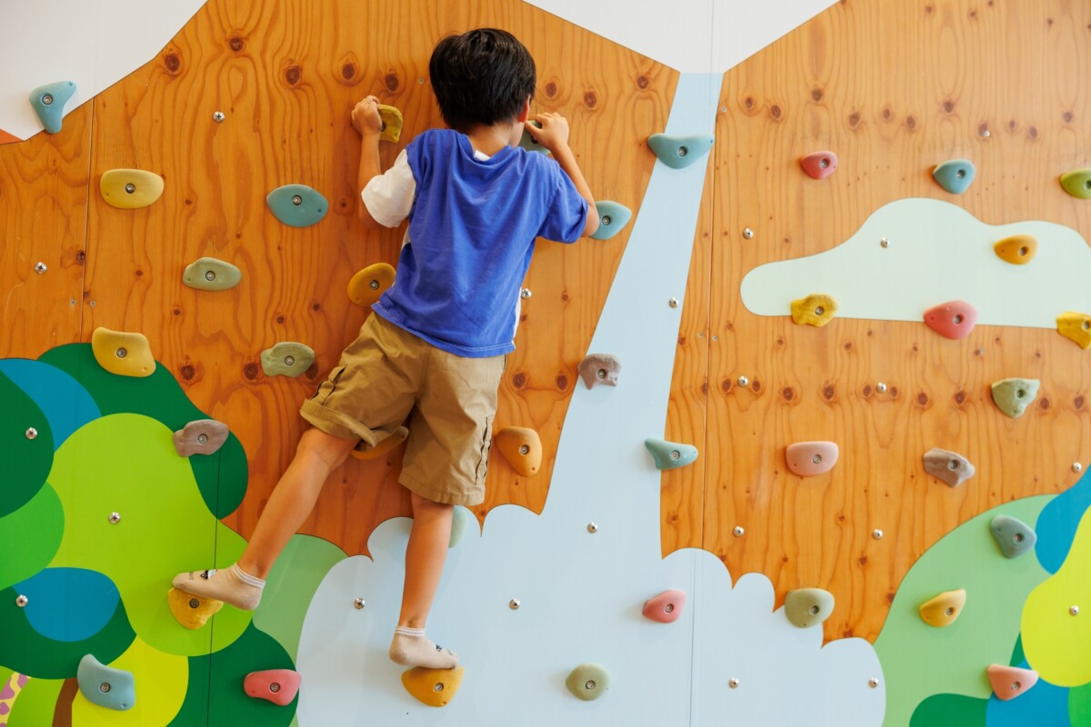 小学1~6年生に向けたクライミング教室で、参加者は8メートルのクライミングウォールにチャレンジすることができます。