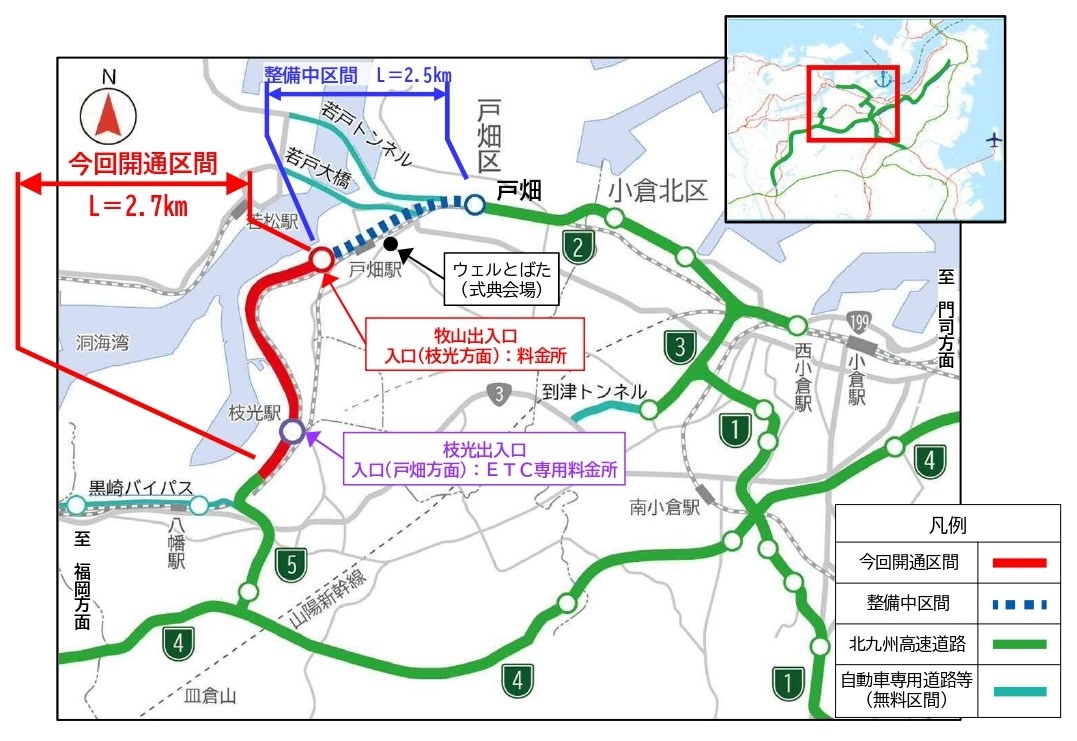 3月1日の午後3時には、都市計画道路戸畑枝光線・北九州高速5号線<牧山~枝光間(延長2.7キロメートル)>が開通されるとのことです。