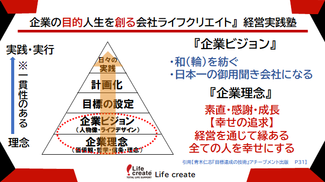 同社は「人生を、創る会社」というスローガンのもと、社員の自己実現を支援する企業です。基盤となる理念「素直」「感謝」「成長」と「幸せの追求」を中心に、目的から実践まで一貫した、ぶれない活動を実現しています。