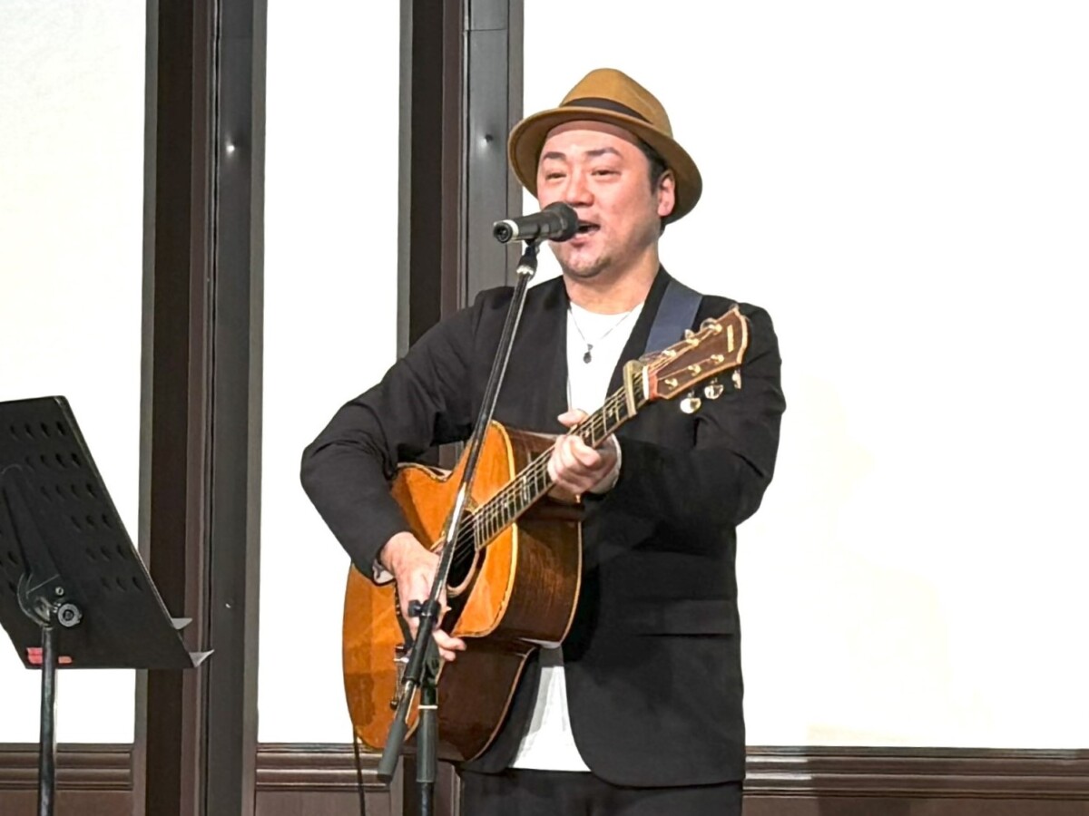 有冨氏のプレゼンテーション後には余興も行われました。余興の最初を飾ったのは、同社のテーマソングを作曲した北九州市観光大使でもある藤田 大吾さん(シンガーソングライター)。
