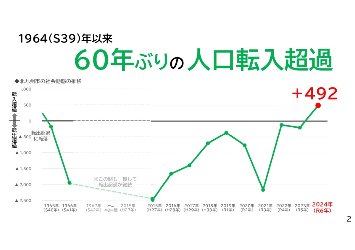 2024年の北九州市内への転入者数が転出者数を上回り、492人増の人口転入超過となりました。人口転入超過となるのは、1964年以来、なんと60年ぶりです。