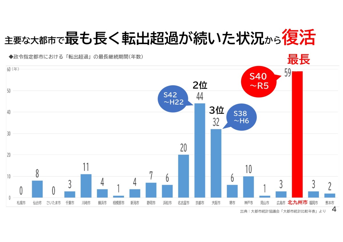 北九州市は1963年に発足。そこから間もない1965年以降、「鉄冷え」や製造業の海外移転などを背景に、59年間にわたって転出者数が転入者数を上回る転出超過が続いていました。これは政令指定都市の中では最長の期間です。