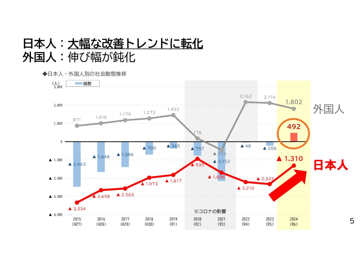 人口転入超過の要因として、外国人は転入超過を維持する一方、大きな変化として、日本人の転出超過が大幅に改善しました。