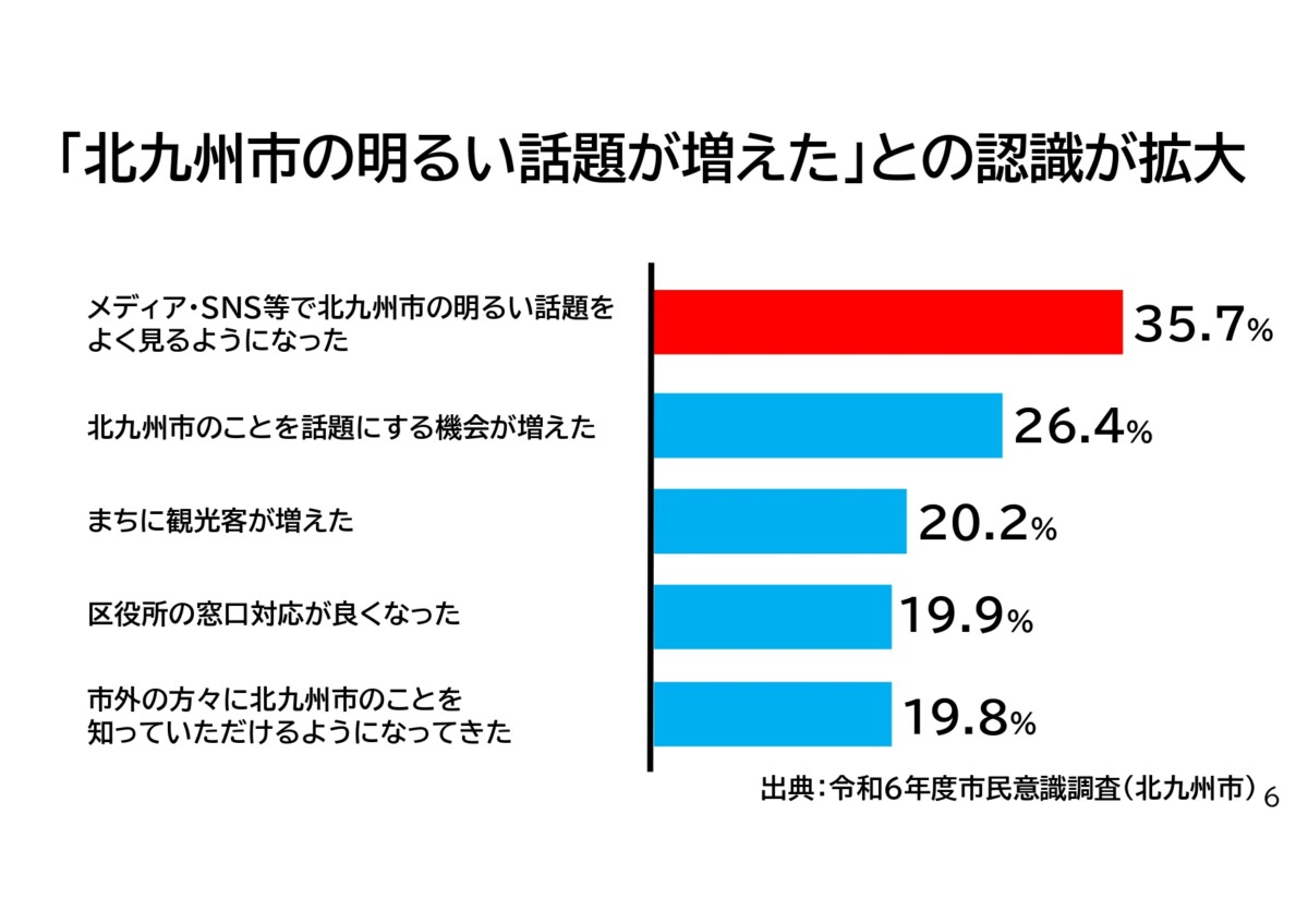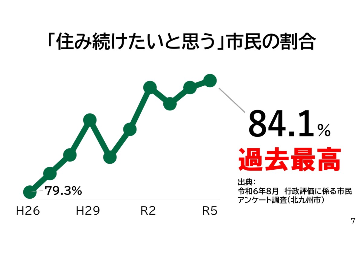 これは、昨年行った市民アンケートにおいて、「住み続けたいと思う」市民の割合が過去最高の84.1%を記録したことや、最近の北九州市のイメージとして「市の明るい話題をよく見るようになった」が最上位となるといった変化が、背景にあるものと考えられます。