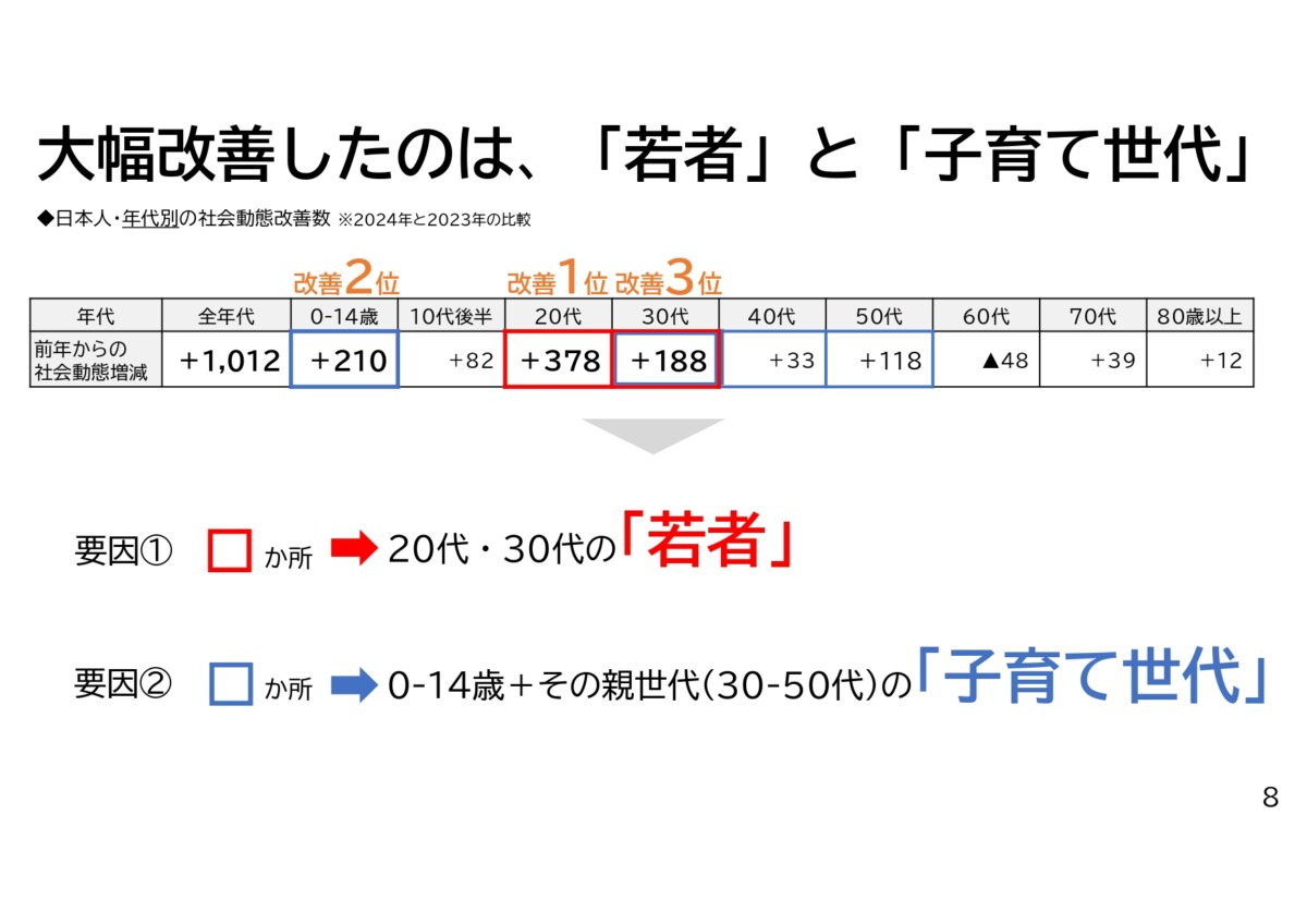 近年悪化が続いていた20代・30代の「若者」の転出超過が改善したこと、14歳以下の子どもがいる「子育て世帯」が転入超過に転化したことにも注目が集まります。