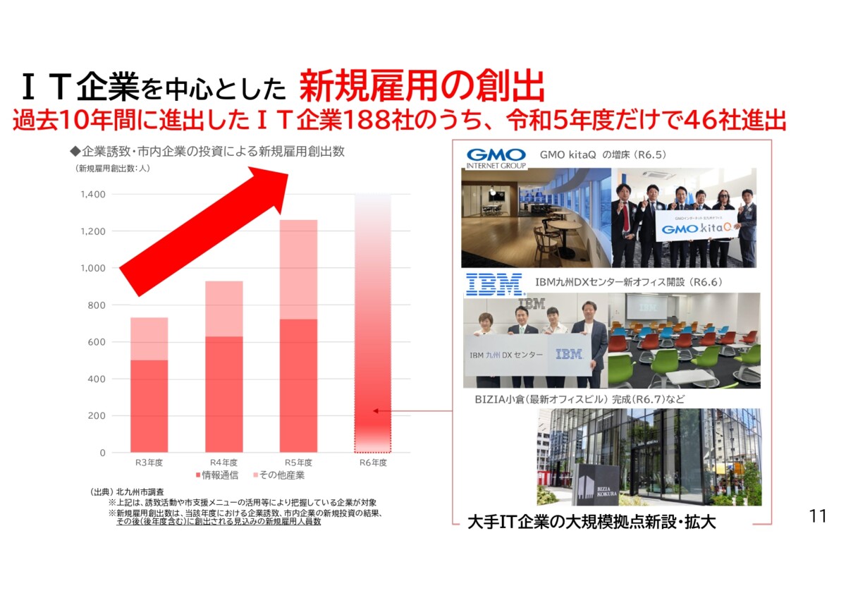 若者に人気で雇用吸収力のあるIT企業は、直近10年間で進出した188社のうち46社が令和5年度に集中しています。さらに、スタートアップの分野でも、「新興・スタートアップ企業」の出現率が全国の市区で1位となるといった成果も現れています。