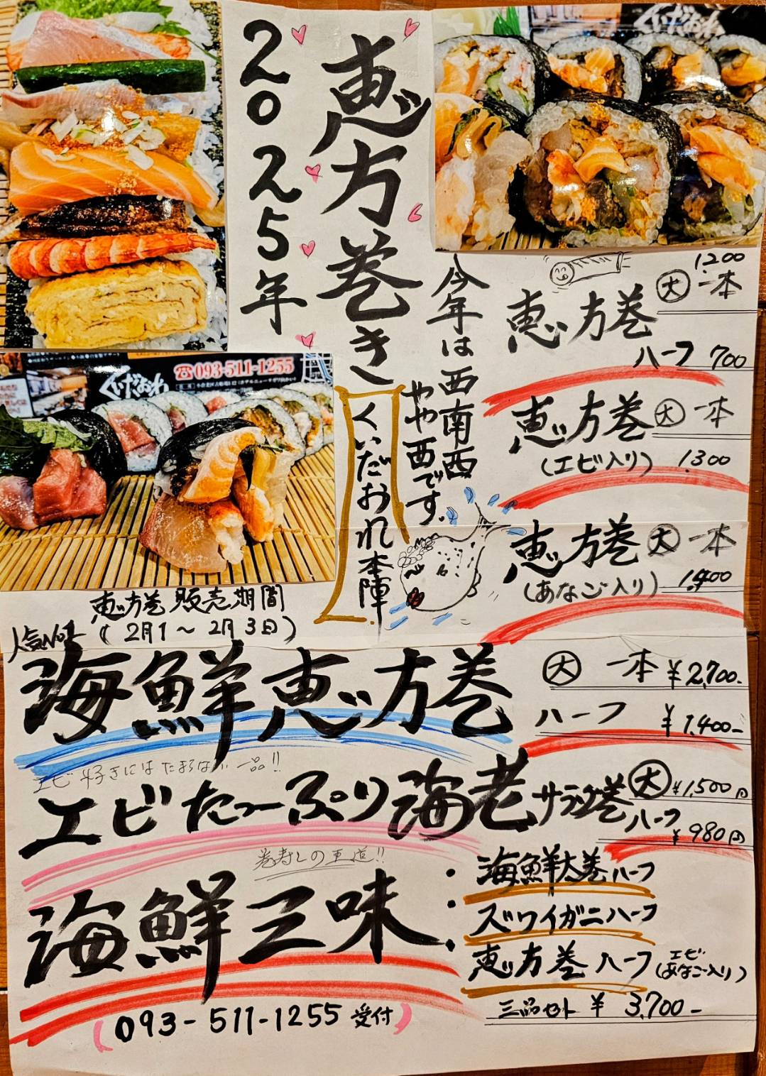 節分といえば恵方巻。今年の方角は「西南西やや西」! くいだおれ本陣ではこだわり抜いた贅沢な恵方巻を販売します。今年は、バリエーション豊かな恵方巻をご用意しました!見た目も豪華で食べ応え抜群!家族や友人と一緒に恵方巻を囲んで福を呼び込みませんか?今年の節分は、くいだおれ本陣の絶品恵方巻で福を呼び込みましょう!