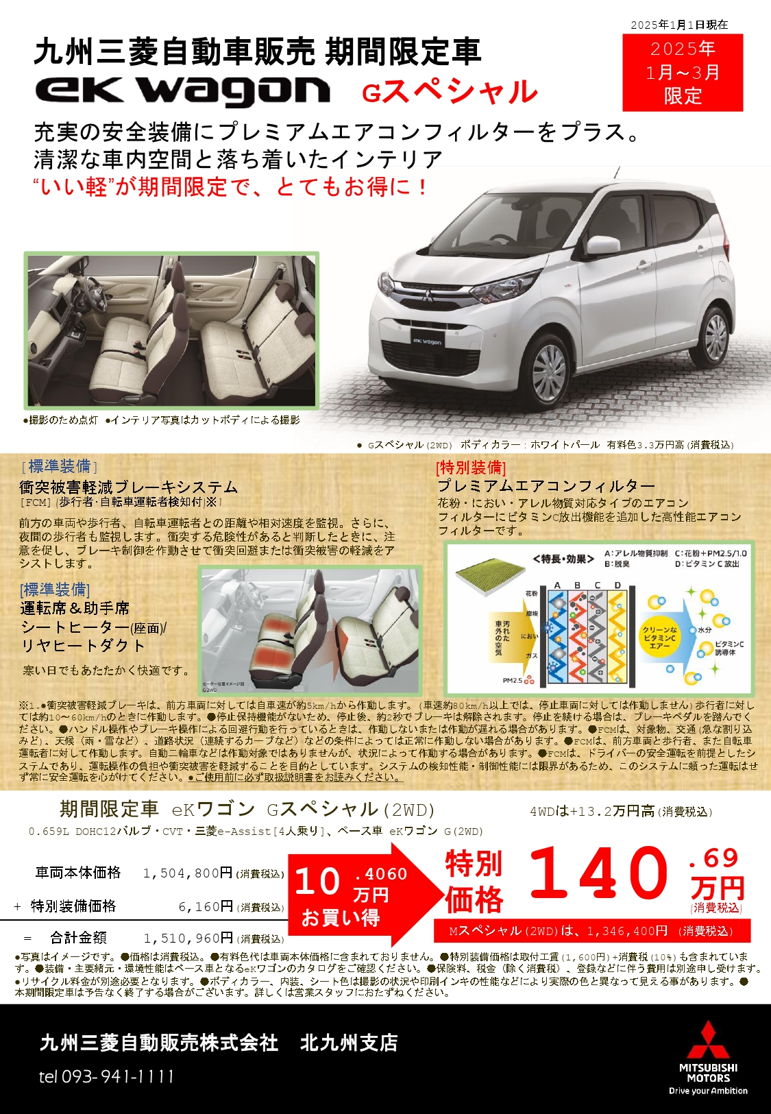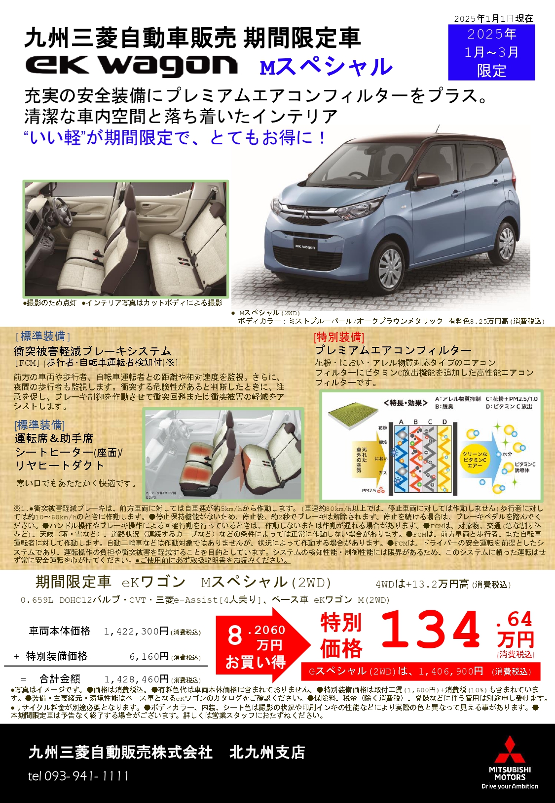 1月から3月の期間限定で、特別装備がついたお得な『ekワゴンスペシャル車』をグレード違いで2種類販売いたします。各店舗に現車もございますので、この機会にお気軽にお問い合わせくださいませ。