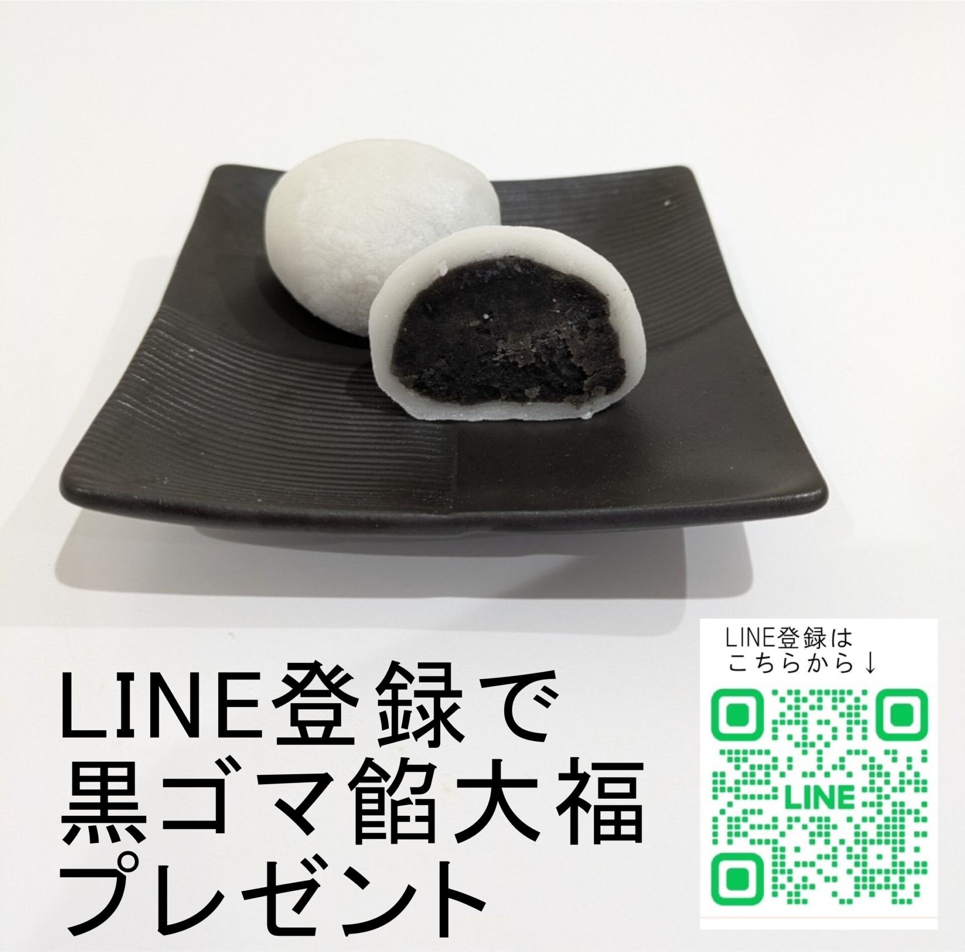 「黒ごま餡大福」プレゼントキャンペーン開催いたします!! 風味豊かなごま油で有名な「かどや」さんの黒ごまと、有機黒糖が配合されたしっとりとした濃厚なくろごま餡を、ふんわりやわらかな求肥でつつみました★