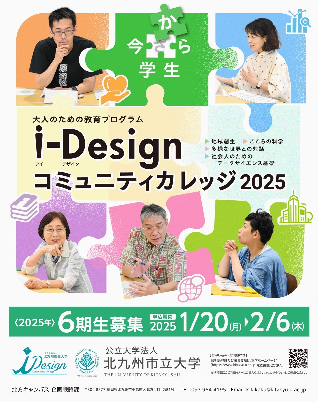 現在、北九州市立大学では、社会人教育プログラム「i-Design(アイデザイン)コミュニティカレッジ」の2025年度履修生を募集しています。社会人の皆様が、ご自身の“未来”を自らデザインするための「学びの場」を本学の知を活かして提供します。あなたも“今から”学生しませんか?