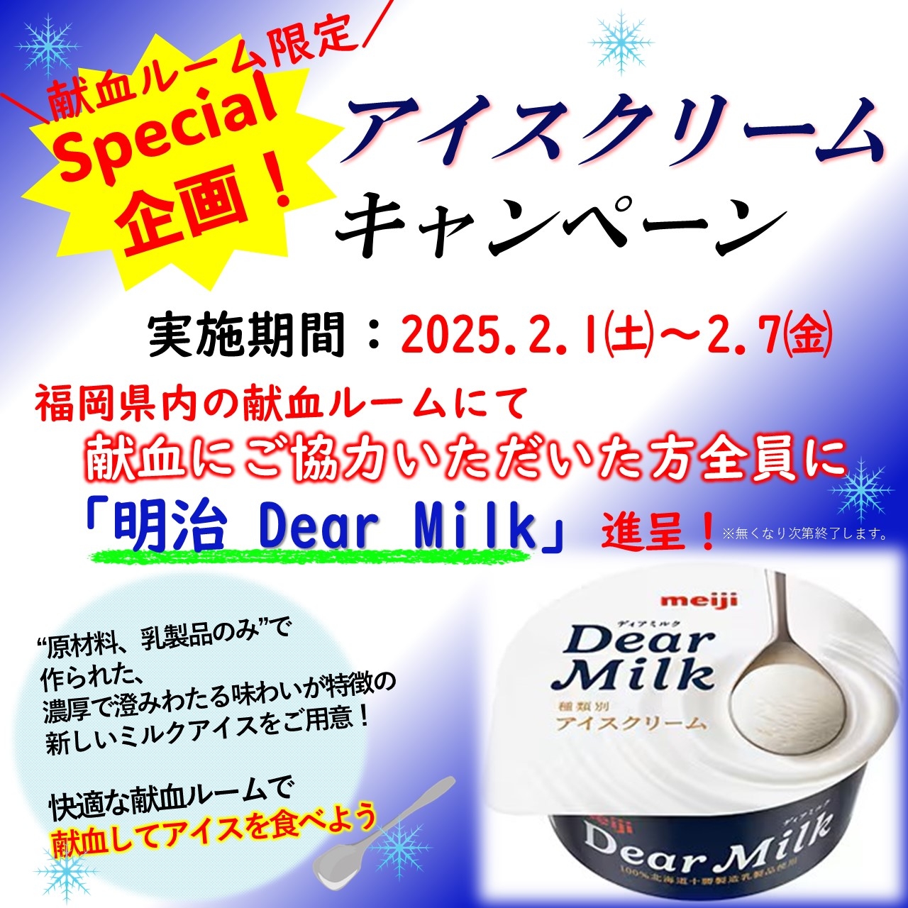 献血ルームくろさきクローバーと魚町銀天街では、2月1日(土)~7日(金)の期間中、献血にご協力いただいた方全員に「明治 Dear Milk」を1個プレゼント。※採血種別は問いません。なくなり次第終了します。
