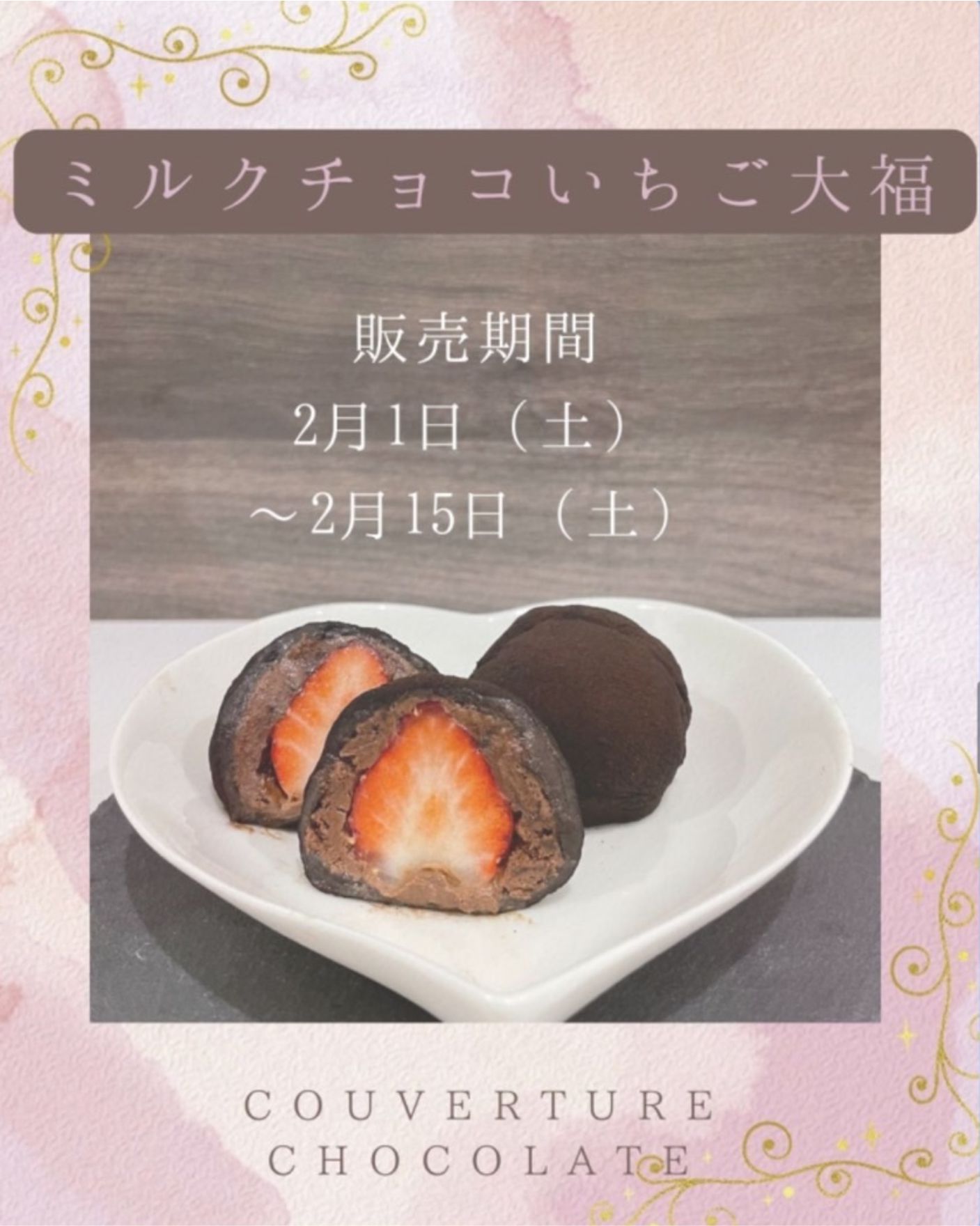 2月1日(土)より、大人気の「ミルクチョコいちご大福(390円/税込)」を数量限定で販売しています★高級クーベルチュールチョコレートを贅沢に使用し、ふわふわで濃厚なミルクチョコクリームと爽やかないちごのハーモニーをお楽しみください!バレンタインデーの贈り物にもぴったり♪大切な人への贈り物にいかかですか?
