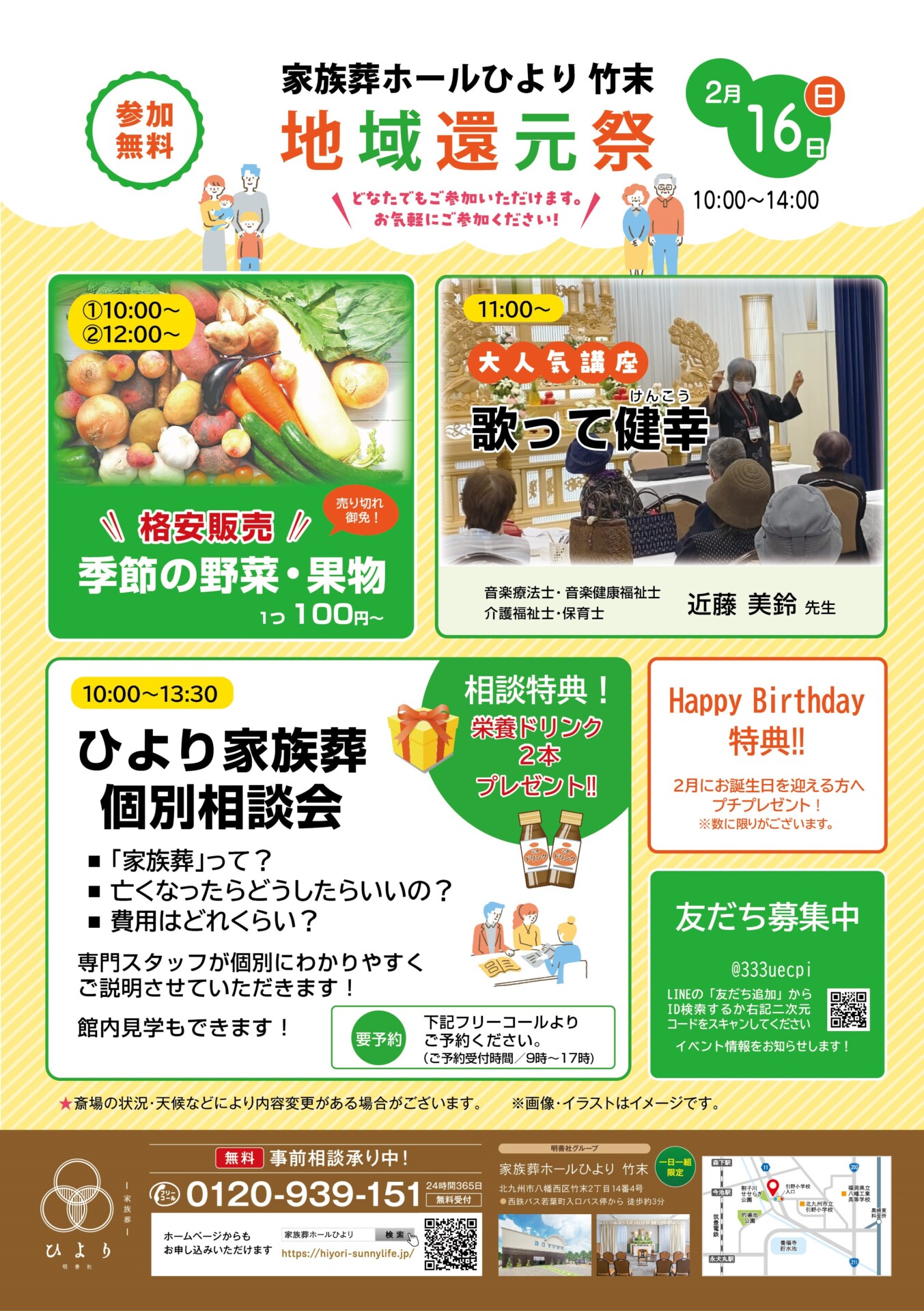 2月16日(日)10:00~14:00、家族葬ホールひより 竹末にて「地域還元祭」を開催いたします。