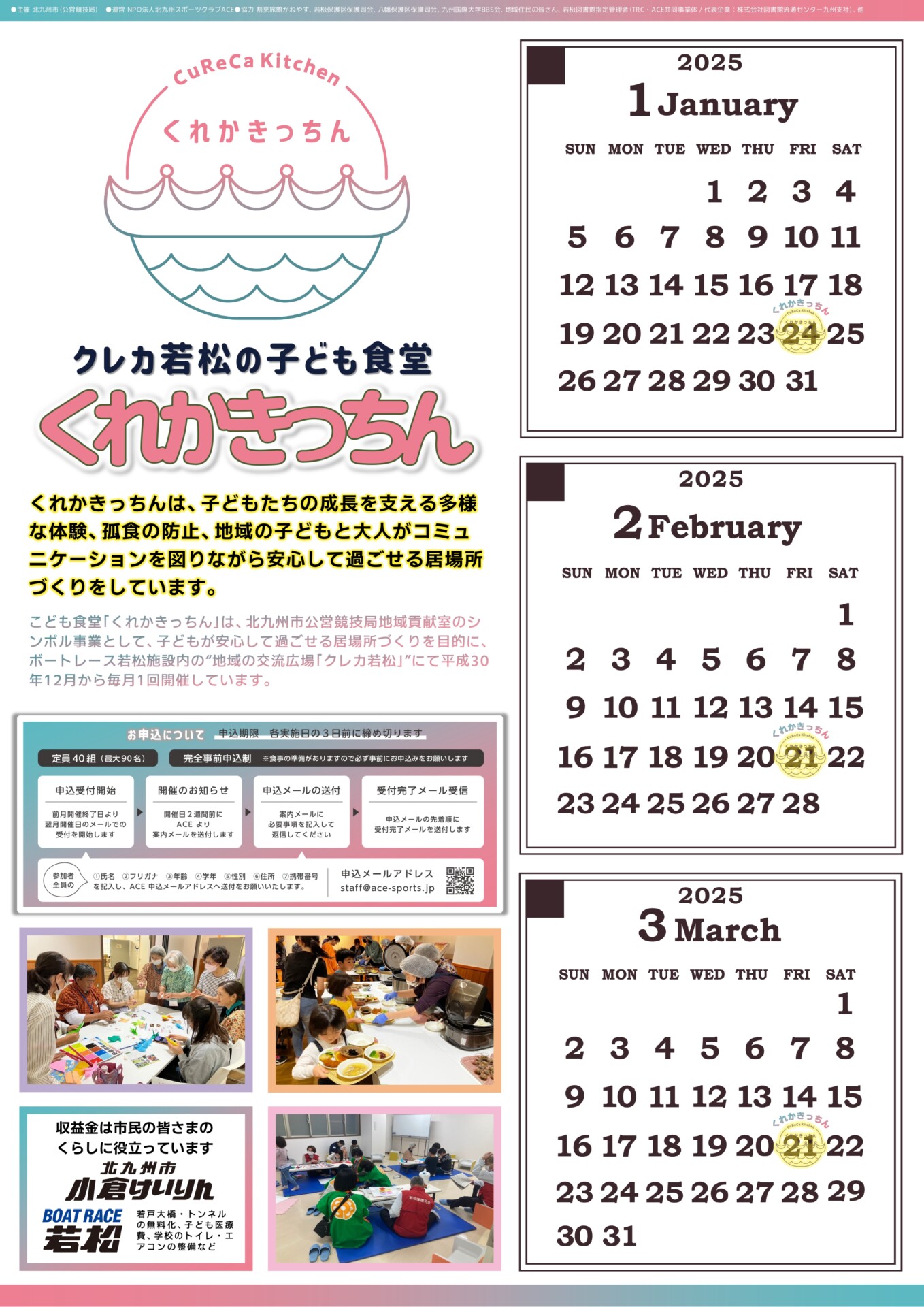 子ども食堂「くれかきっちん」は、北九州市公営競技局地域貢献室のシンボル事業です。市内の子どもたちが安心して過ごせる居場所づくりを目的に、ボートレース若松施設内の”地域の交流広場”「クレカ若松」で平成30年から毎月1回開催しています。