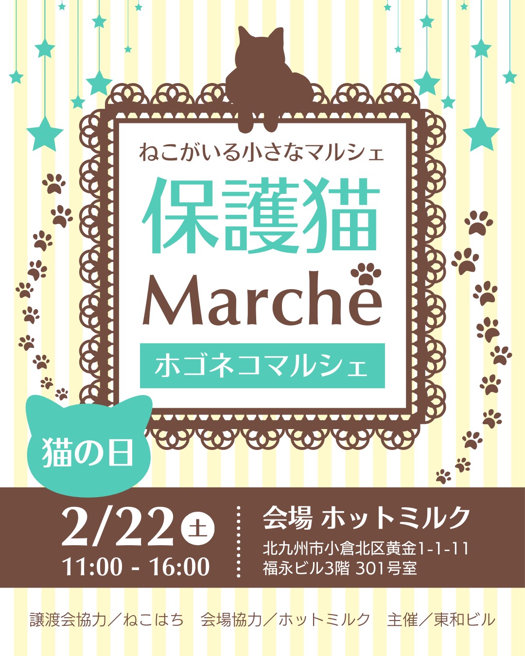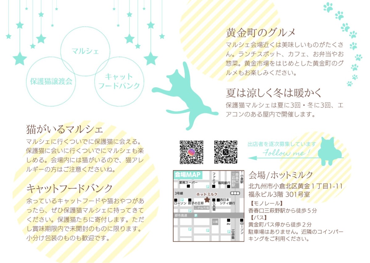 会場は、ホットミルク(北九州市小倉北区黄金1-1-11福永ビル301号室)。保護猫に会いに行くついでにマルシェも楽しめます。