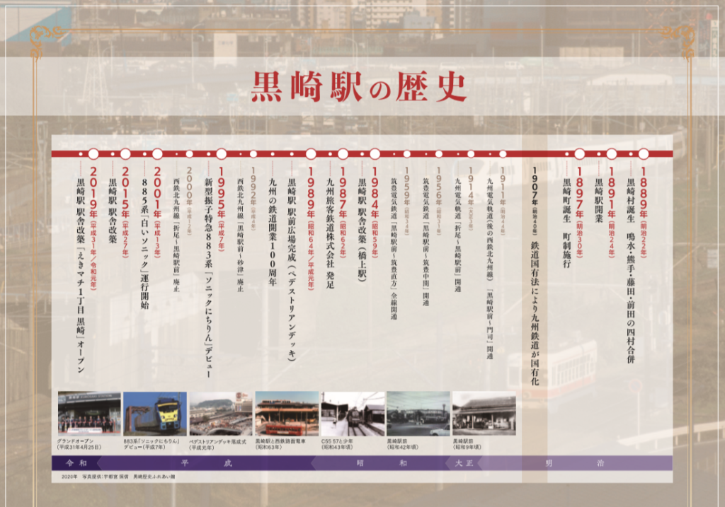 記念切符が封入されている台紙の表紙は、1年前にリニューアルされた直後のJR黒崎駅です。中を開くと、JR黒崎駅の歴史をたどることができます。乗車券には、昭和の黒崎駅を走るD51、旧黒崎駅舎など、当時を知る方や鉄道好きにとってはたまらないデザインとなっています。